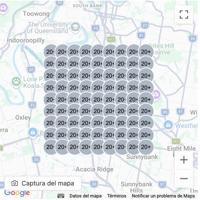 Cada punto muestra la posición en la que aparece el negocio en Google desde esa zona (1 = primera posición / 20+= más allá de la posición 20).